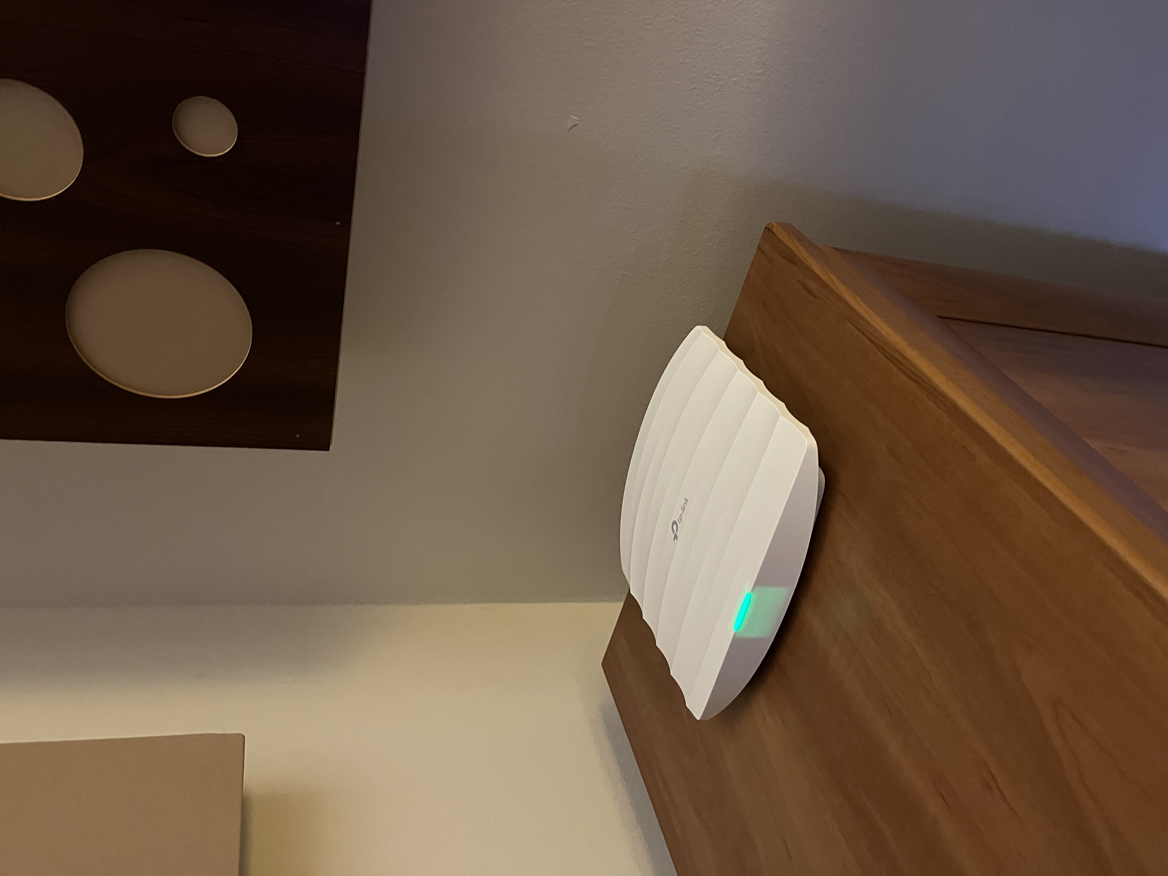 Az AP-k TP-Link, mennyezetre szerelhető AC1350 gigabit AP-k (EAP225). Támogatják a Seamless Roamingot, valamint az ethernet kábelen keresztül táplálhatóak árammal (ún. Power over Ethernet - PoE), így nem kell külön tápot is oda vinni. Viszont használni kell a hozzá adott PoE injectort. Ezt úgy kell elképzelni, hogy konnektorba kell dugni, valamint a switch és az eszköz közé kell bekötni, szintén RJ45 csatlakozókkal. Így viszont bonyolítják a szekrény kábelezését. Az injektor mehetne az AP-hez is, azonban a szekrényben tudok neki szünetmentes tápot adni. Sokat egyszerűsítene egy PoE switch, mely önmaga képes feszültséget tenni az ethernet kábelre, így nem kéne PoE injektor. Bevallom, az AP-kat nem akartam mennyezetre szerelni őket, így maradtak a polcon.