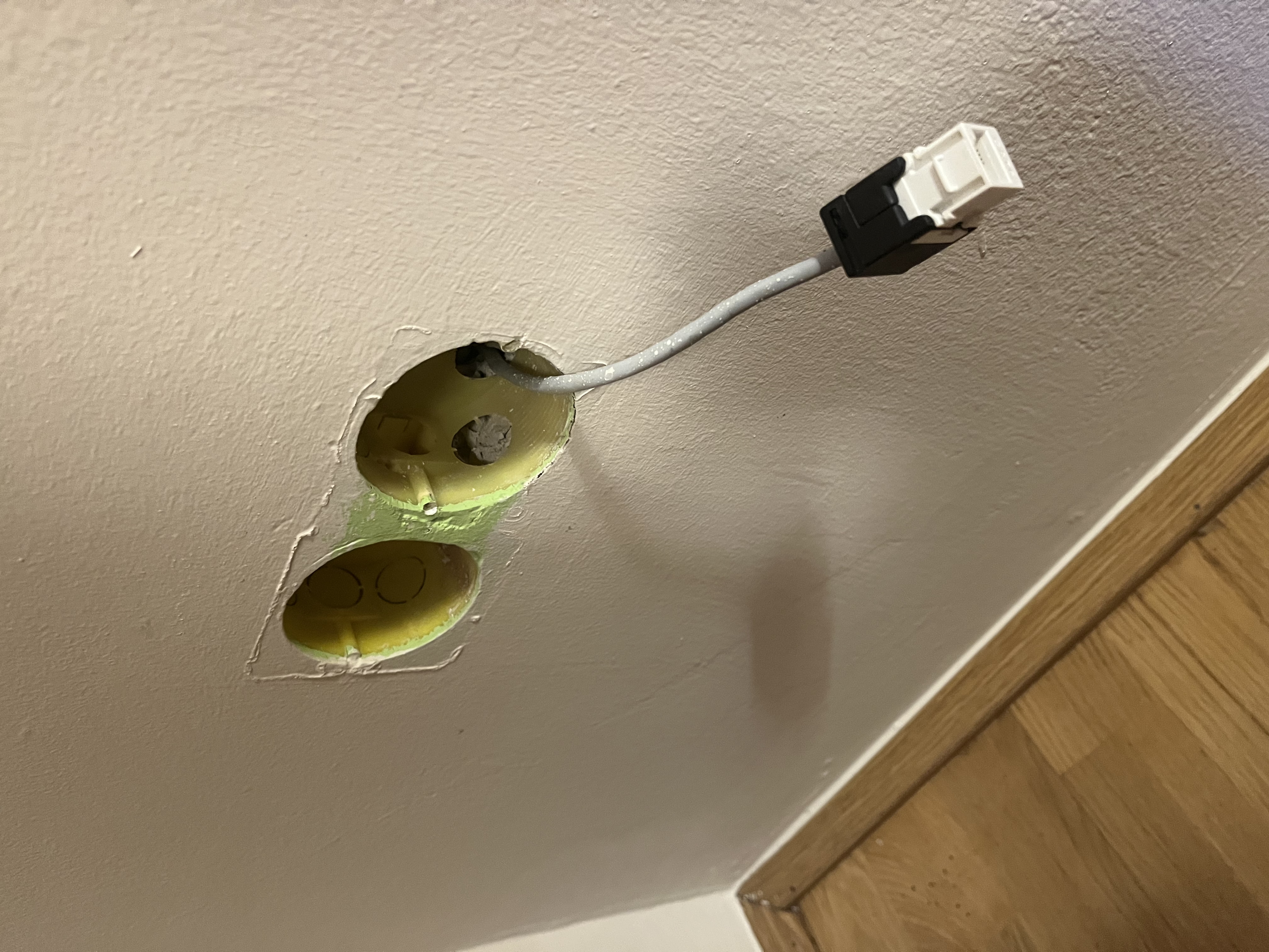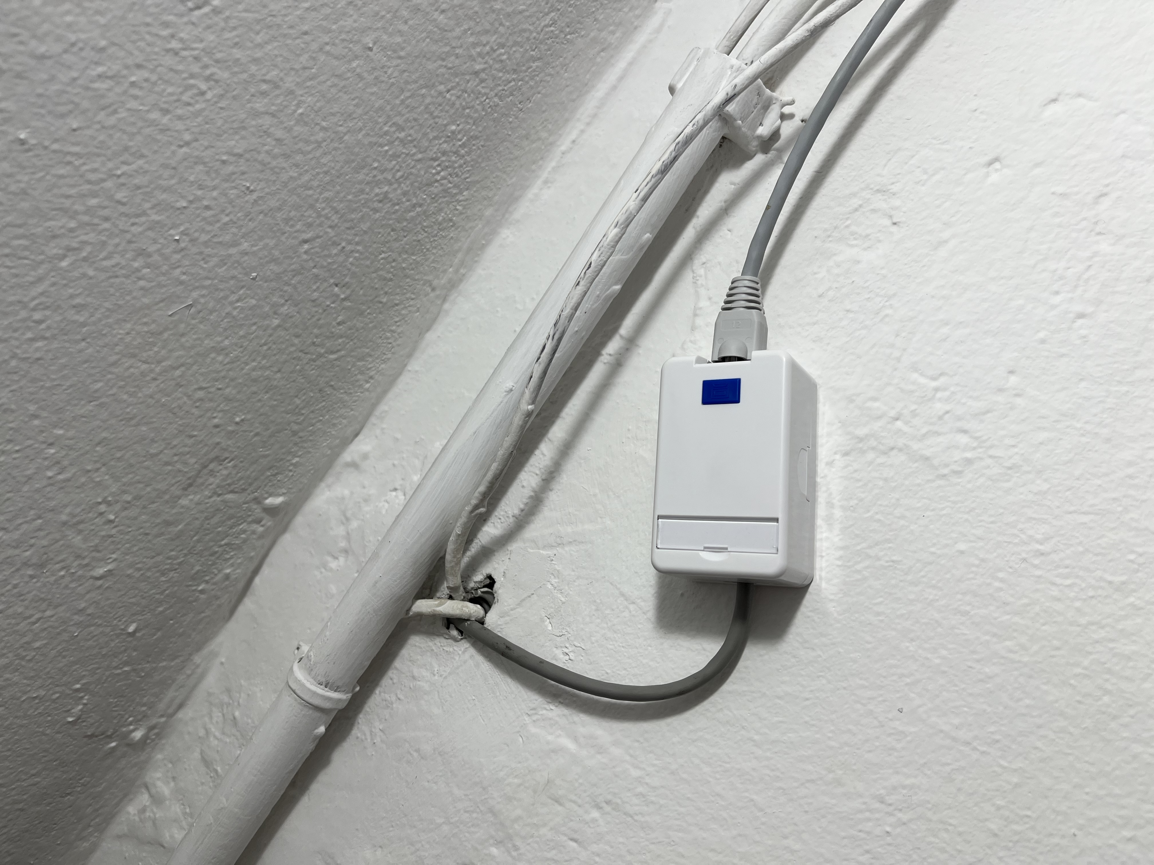 De egy AP-t még le kellett tenni a pincébe. Leírhatatlan volt az örömöm, mikor találtam egy kábelcsatornát, melybe még elfért egy kábel. Mellesleg a riasztó és a kaputelefon kábele ment még benne. Van falon kívül szerelhető doboz is, mely szintén Keystone adapterrel rendelkezik.