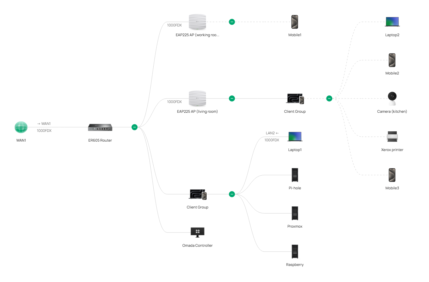 A router egy Omada Gigabit VPN router (ER605). Azért esett erre a választás, mert van multi-wan backupja, azaz pl. hozzá lehet kötni egy 4G/5G routert, és ha kiesik a kábeles internetszolgáltató, akkor automatikusan át tud kapcsolni mobil internetre.
