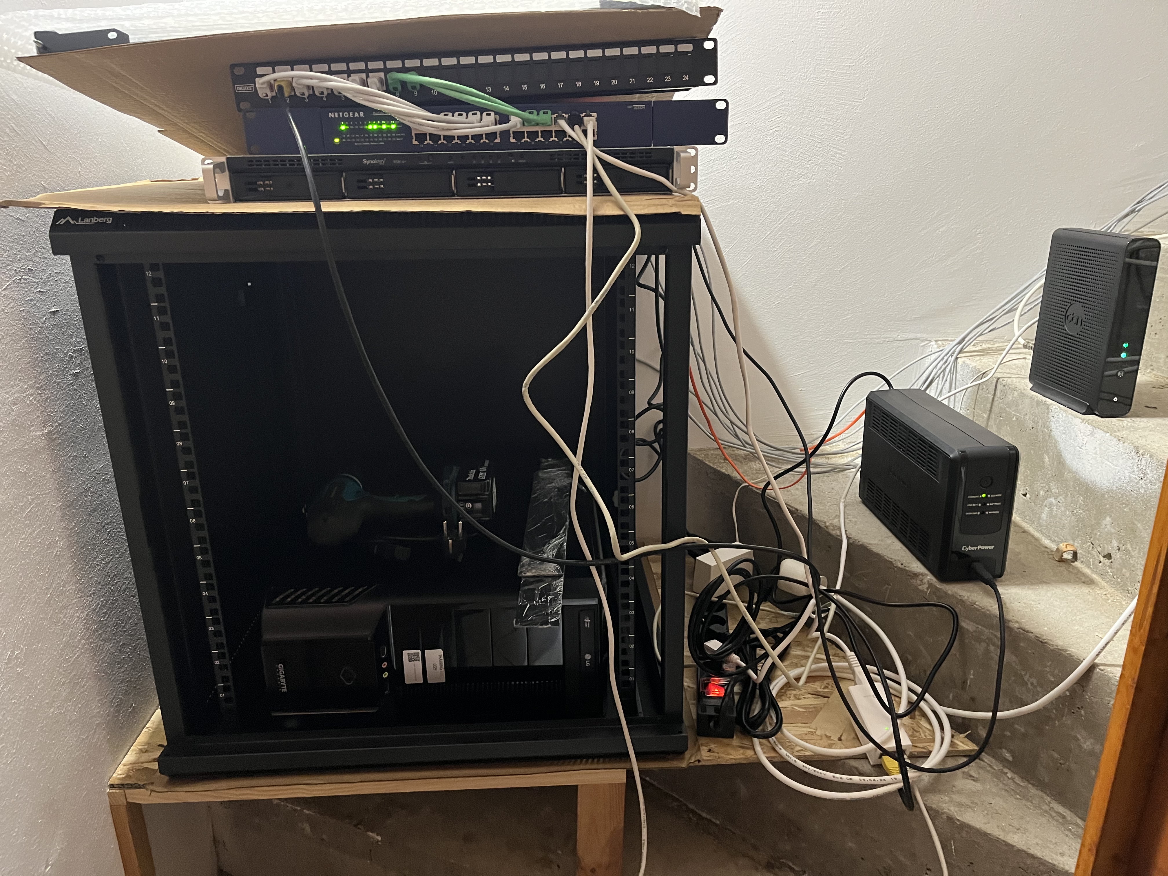 Az egész projektben a legnagyobb problémát az okozta, hogy hova kerüljön a rack szekrény. A lakótérbe nem szerettem volna, a hangja miatt. A padlás nyáron nagyon meleg tud lenni. A pincébe nem tudtam levezetni a kábeleket, nem akartam a födémet átfúrni. Így a padlásfeljáróra tettem. Látható, hogy a lépcsőfokok miatt egy platformot is kellett csinálnom neki OSB lapokból.